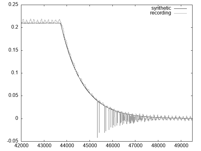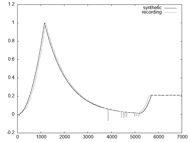 As our goal is not a precise reproduction of the wave generated by the DX7 – this will likely require an analysis at the hardware level – but a characterisation of the envelope, this fits well enough.