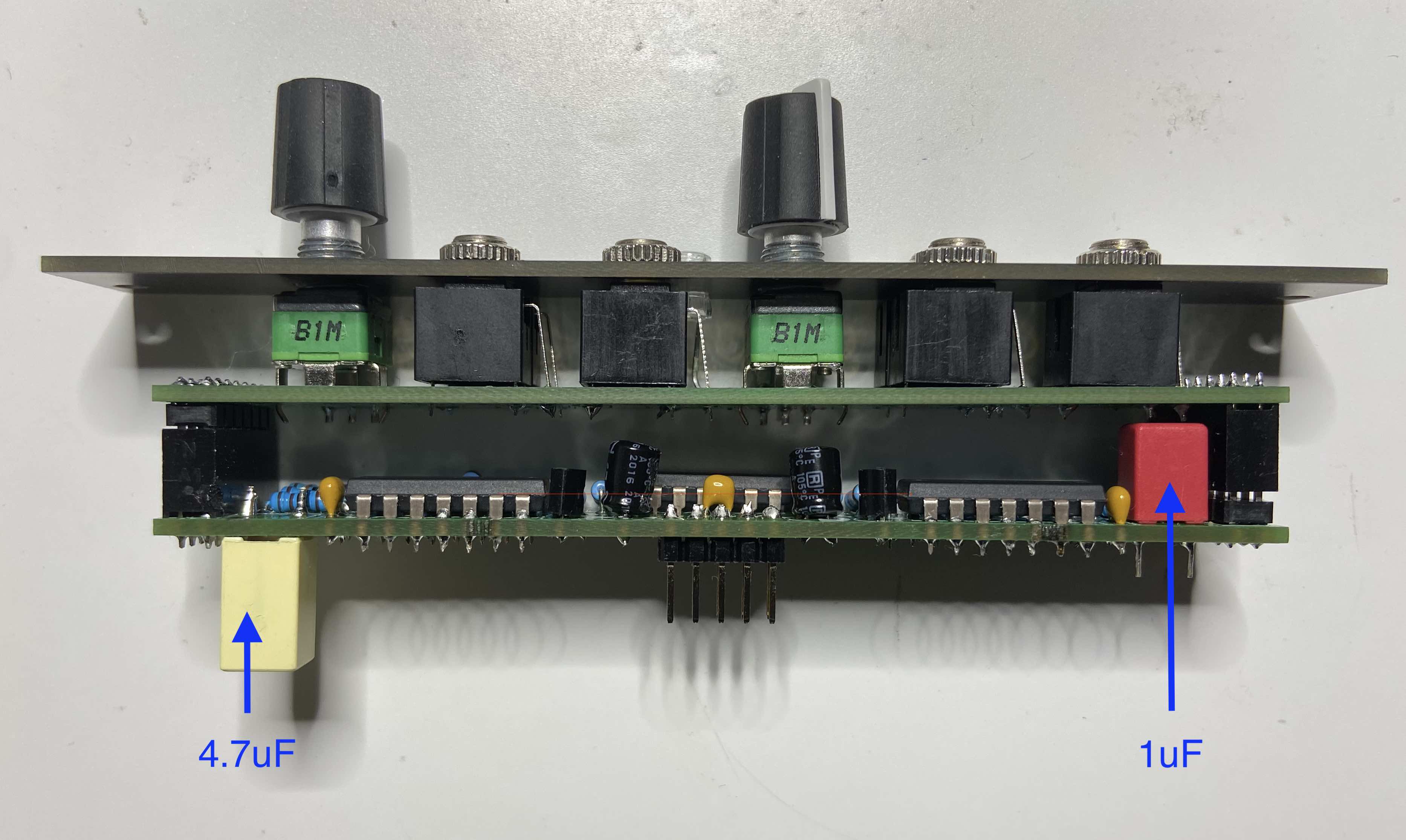 As an example, the picture below shows a MRG LFOs modified with a 4.7 uF capacitor in one of the oscillators (I am using the KEMET R82CC4470Z330K ). The measured frequency range was from .126 Hz (about 8 seconds) to 124Hz.